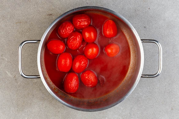 In einem großen Topf ausreichend gesalzenes Wasser für die Pasta zum Kochen bringen. Die Tomaten, die 1TL Chiliflocken, das Tomatenmark und 150ml Wasser in einem zweiten Topf bei mittlerer bis starker Hitze ca. 4Min. abgedeckt kochen, bis die Tomaten weich werden.