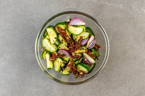 Die Zucchini und die Zwiebeln mit der restlichen Tomaten-Würze vermengen.