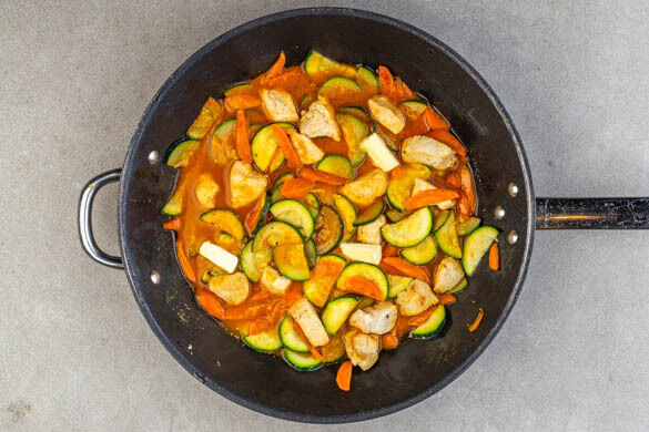 100ml Wasser in die Pfanne geben und zum Kochen bringen. Die Currysauce einrühren und erneut aufkochen. Die Hitze reduzieren und das Curry ca. 10Min. köcheln lassen, bis die Karotten und die Zucchini weich sind und das Fleisch gar ist. 1EL kalte Butter unterrühren und mit Salz und Pfeffer abschmecken.