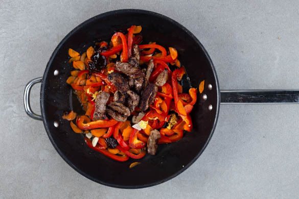 Das Fleisch in einer großen Pfanne mit 1–2EL Pflanzenöl und dem Sesamöl bei starker Hitze ca. 2Min. rundum scharf anbraten. Auf einem Teller beiseitestellen. Die Paprika und die Karotten in derselben Pfanne mit 1EL Pflanzenöl bei starker Hitze 2–3Min. anbraten.