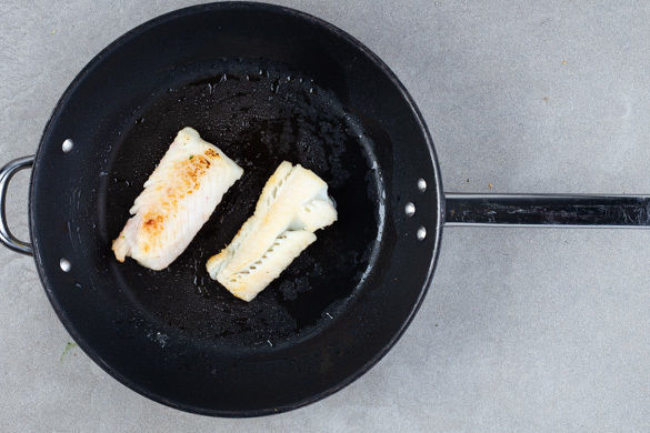 Den Fisch kalt abspülen, trocken tupfen und in 4 gleich große Stücke schneiden. Von beiden Seiten mit Salz und Pfeffer würzen, in 2–3EL Mehl wenden und in einer großen Pfanne mit 2EL Butter bei mittlerer Hitze auf jeder Seite ca. 2Min. anbraten. Die Pfanne vom Herd nehmen und den Fisch noch 2Min. ziehen lassen, dann mit dem Salat und der Sauce anrichten und servieren.
