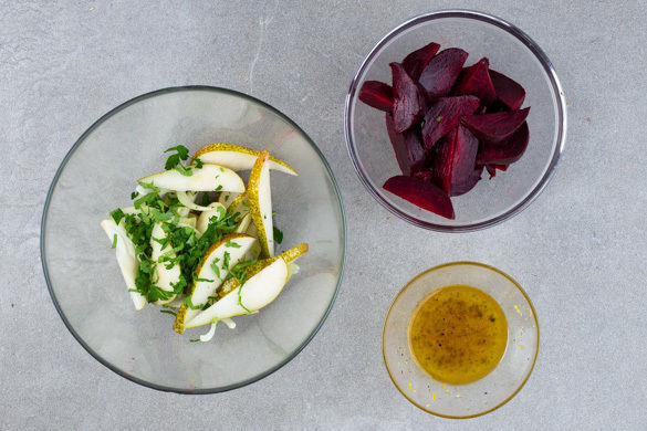 Die Rote Bete abtropfen lassen und in ca. 1cm breite Spalten schneiden. Die Birnen vierteln, entkernen und in ca. 0,5cm dünne Spalten schneiden. Die Petersilie samt Stängeln fein hacken.