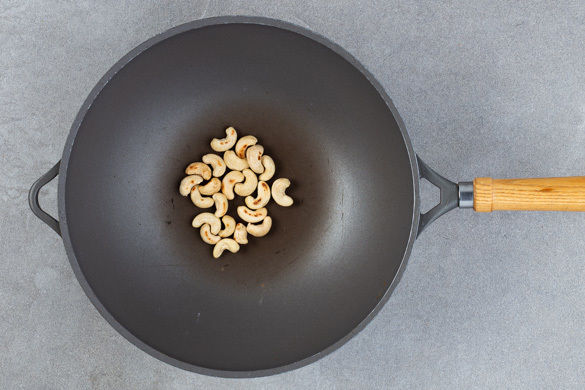Die Cashews in einer großen Pfanne oder in einem Wok bei mittlerer Hitze ohne Zugabe von Fett ca. 1Min. anrösten. Auf einem Teller beiseitestellen.