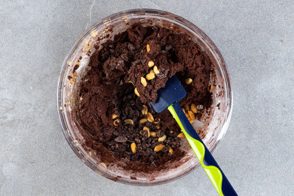Die Schokolade in kleine Stücke hacken. Die 1/2 der Schokolade und die 1/2 der Erdnüsse untermengen. 2 Backbleche mit Backpapier auslegen.