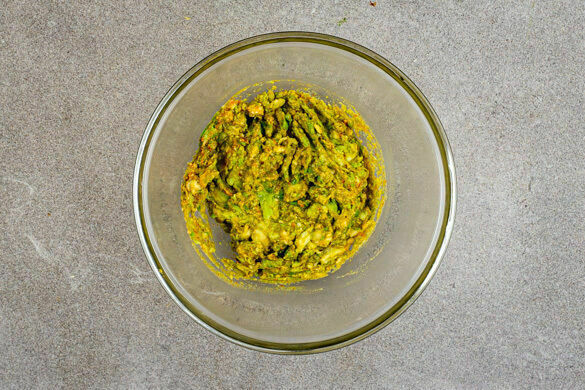 Die Avocados halbieren, den Kern entfernen und das Fruchtfleisch mit einem Löffel aus der Schale lösen. In eine Schüssel geben, die Gewürzmischung und 1EL Essig hinzufügen und mit einer Gabel zu einer cremigen Guacamole zermusen.