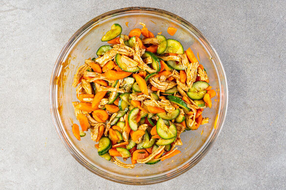 Das Fleisch mit den Händen oder zwei Gabeln in dünne Streifen zerkleinern und mit dem Gemüse vermengen. Nach Belieben mit Salz und Pfeffer abschmecken.