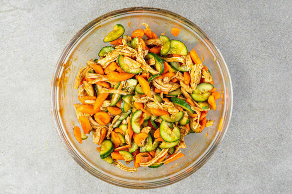 Das Fleisch mit den Händen oder zwei Gabeln in dünne Streifen zerkleinern und mit dem Gemüse vermengen. Nach Belieben mit Salz und Pfeffer abschmecken.