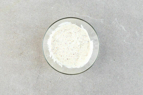 Die Meerrettichwurzel schälen und fein reiben. Den Joghurt und 3/4 des Meerrettichs mit 2EL Senf, 2EL Pflanzenöl, 2TL Essig, 1TL Salz und je 1 Prise Pfeffer und Zucker zu einem Dressing verrühren.