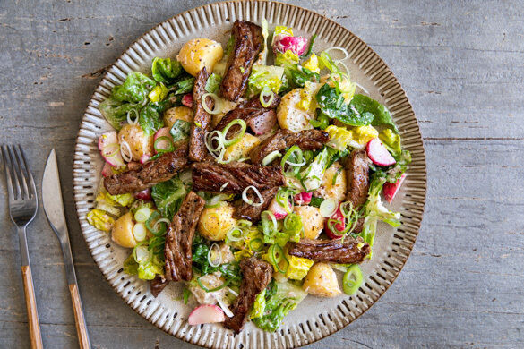 Dieser skandinavische Kartoffelsalat bringt im Nu eine frische Brise an deinen Tisch. Besonders, wenn du das Joghurtdressing mit frisch geriebenem Meerrettich aufpeppst! Auch die Radieschen bekommen eine Sonderbehandlung und werden scharf angebraten, bevor sie mit knackigen Romanablättern und Lauchzwiebeln in die Schüssel hüpfen. Ganz obenauf präsentiert sich zartes Rindergeschnetzeltes. Herz, was willst du mehr?