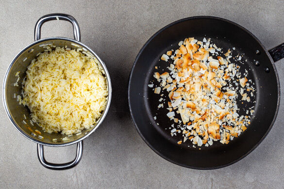In einem kleinen Topf 300ml leicht gesalzenes Wasser zum Kochen bringen. Den Reis in das kochende Wasser geben und abgedeckt bei niedrigster Hitze 8–10Min. kochen, bis das Wasser aufgesogen und der Reis gar ist. Noch ca. 5Min. ohne Hitzezufuhr ziehen lassen.
