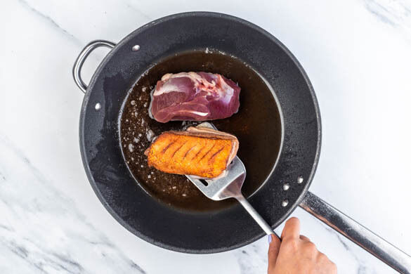 Das Fleisch trocken tupfen und die Haut mehrmals kreuzweise einschneiden. Mit Salz würzen und das Fleisch mit der Hautseite nach unten in eine große, ofenfeste, kalte Pfanne legen und dann bei mittlerer Hitze 5–8Min. braten, bis das Fett ausgetreten und die Haut goldbraun und knusprig ist. Das Fleisch wenden und 4–7Min. im Ofen backen, dann ca. 5Min. ruhen lassen.