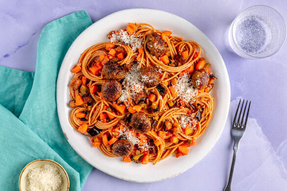 Wenn du nach einem langen Tag nicht so viel Zeit in der Küche verbringen, aber dennoch ein wunderbares Abendessen servieren möchtest, dann haben wir genau das Richtige für dich: Dieses leicht zubereitete Vollkornpastagericht mit saftigen Geflügelhackbällchen, Auberginen aus dem Ofen, Karotten, Sellerie und passierten Tomaten ist ein fruchtig-feiner Genuss. Mit geriebenem Käse serviert heißt es dann nur noch: „Buon appetito!“