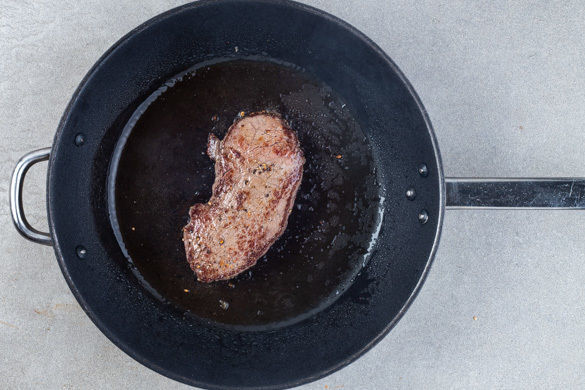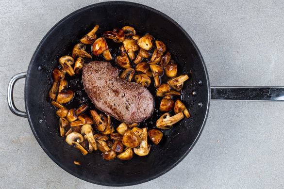 Die Pilze in der Pfanne mit 1–2EL Pflanzenöl bei starker Hitze 2–3Min. anbraten. Mit der 1/2 der Teriyakisauce, der Bohnensauce und 2–3EL Wasser ablöschen, dann das Fleisch samt Bratensaft dazugeben und die Pfanne 5–6Min. in den Ofen geben, bis das Fleisch medium durch ist. Tipp: Je nach Dicke des Fleisches kann die Garzeit variieren.