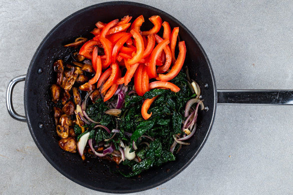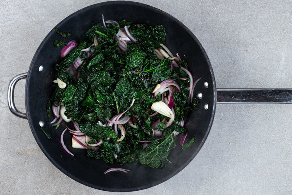 Den Schwarzkohl in einer großen Pfanne mit 1–2EL Pflanzenöl bei mittlerer Hitze 3–4Min. braten. Die Zwiebeln und den Knoblauch untermengen und ca. 1Min. mitbraten. Die Pfanne vom Herd nehmen.