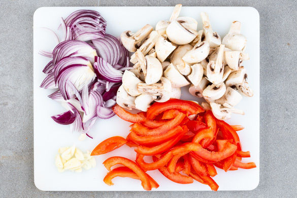 Den Backofen auf 170°C Umluft (190°C Ober-/Unterhitze) vorheizen. Die Zwiebel schälen, halbieren und in feine Streifen schneiden. Den Knoblauch schälen und in hauchdünne Scheibchen schneiden. Die Champignons ggf. säubern und je nach Größe vierteln oder sechsteln. Die Tomaten vierteln, vom Kerngehäuse befreien und in dünne Streifen schneiden.
