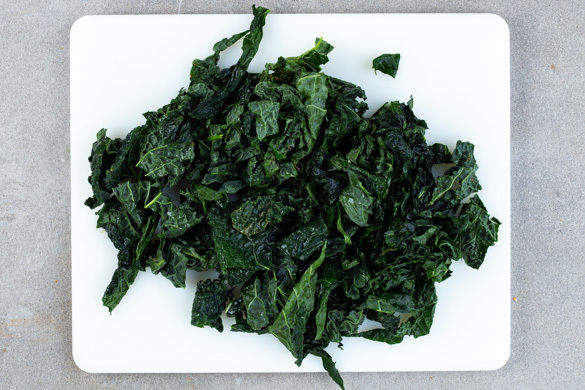 Den Schwarzkohl vom Strunk entfernen, dazu am besten das Strunkende festhalten und die Schwarzkohlblätter mit der anderen Hand abstreifen. Die Blätter in ca. 2cm breite Streifen schneiden.