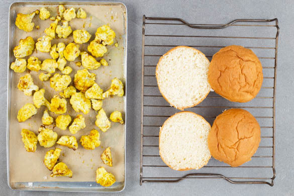 Den Blumenkohl mit 2–3EL Olivenöl und dem Currypulver vermengen und leicht salzen. Auf einem mit Backpapier ausgelegten Backblech 15–18Min. im Ofen backen. Die Burgerbrötchen aufschneiden und gegen Ende der Backzeit 3–4Min. im Ofen aufbacken.