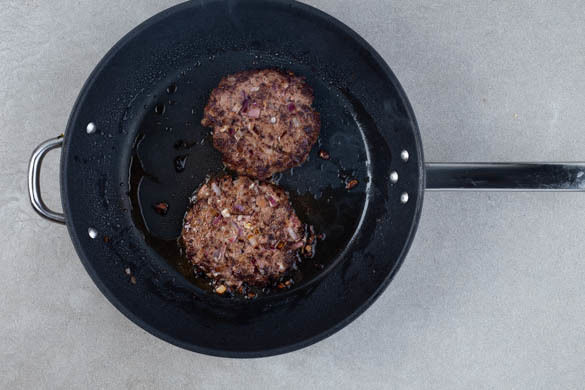 Die Pattys in einer großen Pfanne mit 1–2EL Olivenöl bei mittlerer Hitze auf jeder Seite 3–4Min. braten, bis das Fleisch durch ist. Tipp: Wer die Pattys lieber medium gebraten genießen möchte, kann sie auf jeder Seite nur 2Min. anbraten. Die Zwiebelstreifen 1–2Min. mitbraten.