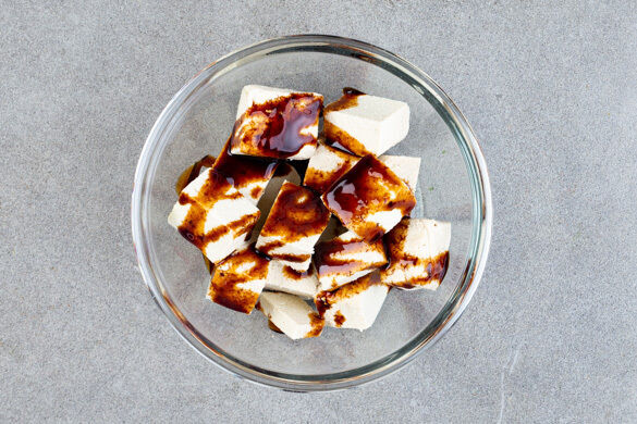 Den Tofu trocken tupfen und in ca. 2cm große Würfel schneiden. Den Ingwer schälen und fein reiben. Die Teriyakisauce mit dem Ingwer und dem Tofu vermengen und den Tofu in der Würzsauce ziehen lassen.