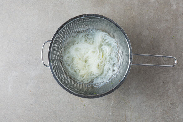 Die Nudeln in das kochende Wasser geben, den Topf vom Herd nehmen und die Nudeln 3–5Min. gar ziehen lassen. In ein Sieb abgießen, kalt abschrecken und abtropfen lassen. Tipp: Um die Weiterverarbeitung zu erleichtern, ggf. die Nudeln mit einer sauberen Schere 1–2 Mal durchschneiden.