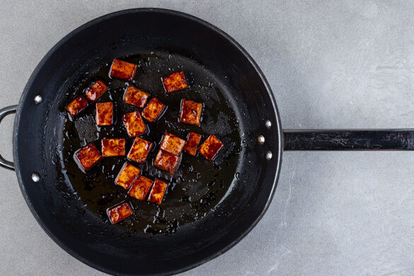 Den Tofu mit möglichst wenig Würzsauce in einer großen Pfanne mit 1EL Pflanzenöl bei mittlerer Hitze 3–5Min. goldbraun anbraten. Dann die restliche Würzsauce dazugeben, kurz erwärmen und den Tofu gut in der Sauce wenden. Den Glasnudelsalat auf Teller verteilen, den Tofu darauf anrichten und mit dem restlichen Koriander garniert servieren.