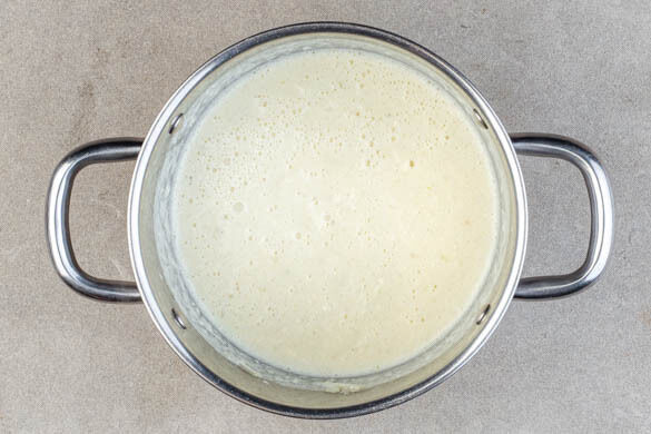 Sobald der Blumenkohl gar ist, den Topf vom Herd nehmen und den Ziegenfrischkäse einrühren. Mit einem Stabmixer cremig pürieren. Probieren und ggf. mit Salz und Pfeffer nachwürzen.