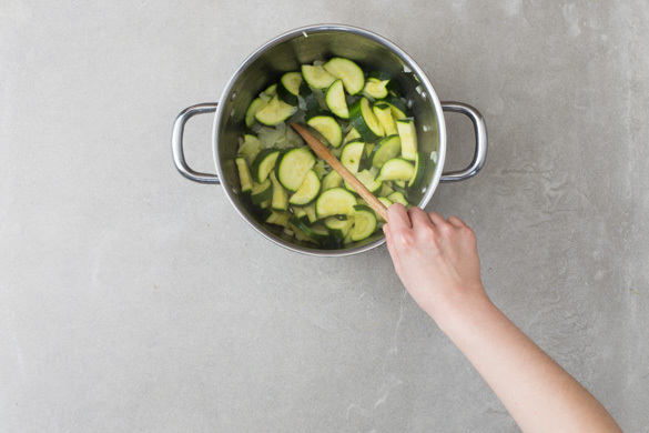 Die Zucchini, die Zwiebeln, den Knoblauch und die Chili nach Geschmack in einem mittelgroßen Topf mit 1EL Olivenöl bei mittlerer Hitze ca. 2Min. leicht anschwitzen. Mit 1 Prise Salz würzen und abgedeckt 10–15Min. garen, bis die Zucchini weich sind. Ggf. die Temperatur reduzieren, damit das Gemüse nicht anbrennt.