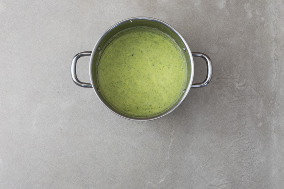 Sobald die Zucchini weich sind, die Kokosmilch und die Brühe angießen und alles gut verrühren. Die Suppe einmal aufkochen und dann bei mittlerer Hitze ca. 5Min. köcheln lassen. Die Limette halbieren und auspressen.