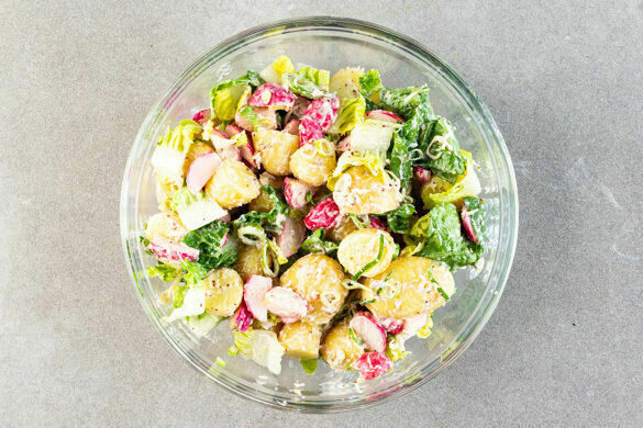 Die Kartoffeln abgießen und abtropfen lassen, dann mit den Radieschen, der 1/2 der Lauchzwiebeln und dem Dressing vermengen. Die Romanastreifen unterheben und den Salat mit Salz, Pfeffer und Essig abschmecken.