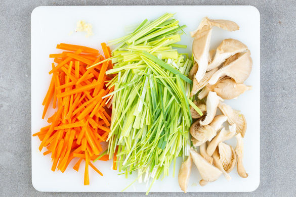 Die Karotten schälen, halbieren und in dünne Streifen schneiden. Den Lauch längs halbieren, in ca. 5cm lange Stücke zerteilen und diese in sehr dünne Streifen schneiden. Die Pilze ggf. säubern und je nach Größe längs halbieren oder vierteln. Den Knoblauch schälen und sehr fein würfeln oder durch eine Knoblauchpresse drücken.