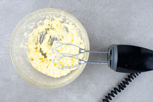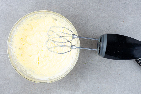 Den Backofen auf 180°C Umluft (200°C Ober-/Unterhitze) vorheizen. Die Butter in kleine Würfel schneiden und 2–3Min. im Ofen oder 20Sek. in der Mikrowelle erwärmen, aber nicht schmelzen. Die Zitronenschale abreiben, dann die Zitronen halbieren und auspressen. Die Butter mit 300g Zucker, der Zitronenschale und 1–2 Prisen Salz mit einem Handrührgerät schaumig rühren.