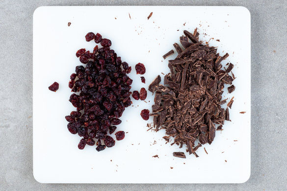 Die Cranberrys grob hacken. Die Schokolade fein hacken. Die gebackene Granolamischung auf Raumtemperatur oder vollständig auskühlen lassen, dann die Cranberrys und die Schokolade untermischen. Diese Menge reicht für 8 Portionen. Das Granola kann luftdicht verpackt bis zu 2 Wochen aufbewahrt werden. Am besten mit Joghurt oder Milch genießen!