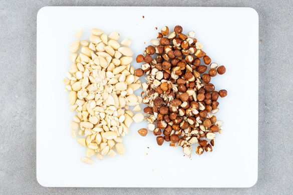 Den Backofen auf 170°C Umluft (190°C Ober-/Unterhitze) vorheizen. Die Haselnüsse und die Mandeln grob hacken.