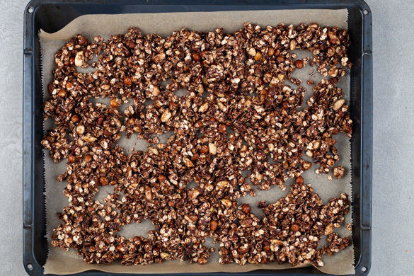 Die Granolamischung auf zwei mit Backpapier ausgelegten Backblechen gleichmäßig verstreichen und ca. 15Min. im Ofen backen. Nach der Hälfte der Zeit einmal durchrühren und wieder gleichmäßig verteilen, dann weiterbacken.