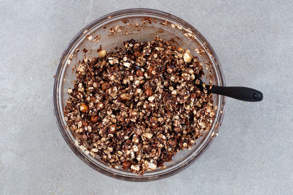 Wer einmal selbst gemachtes Granola probiert hat, möchte sich zum Frühstück nie wieder mit den herkömmlichen Flockenmischungen aus dem Supermarkt zufrieden geben! Hier vereinen sich Haselnüsse und Mandeln, getrocknete Cranberrys, Schokolade und bestes Kakaopulver, um dir und deinen Lieben den Start in den Tag zu versüßen. Granola schmeckt aber auch prima als Snack am Nachmittag, wenn du einen Energieschub gebrauchen kannst!