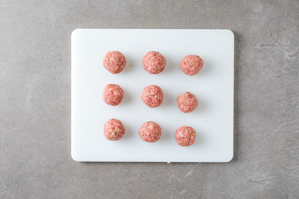 Inzwischen die Zwiebel schälen, halbieren und möglichst fein würfeln. Das Hackfleisch mit der 1/2 der Zwiebeln und der Gewürzmischung nach Geschmack verkneten und mit Salz und Pfeffer würzen. Aus der Hackfleischmasse 3–4cm große Kugeln formen.