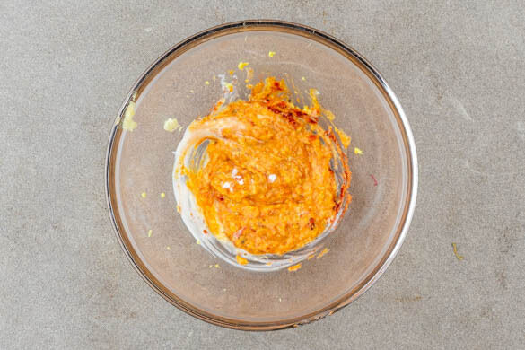 Den Backofen auf 220°C (200°C Umluft) vorheizen. 1EL Joghurt, 1EL Currysauce, die Knoblauch-Ingwer-Paste und die Gewürzmischung zu einer Würzpaste verrühren.