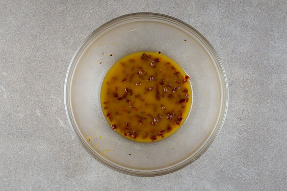 Den Fenchel jeweils längs vierteln, dann in sehr dünne Streifen schneiden, dabei den harten Strunk entfernen. Den Fenchel mit dem Dressing vermengen.