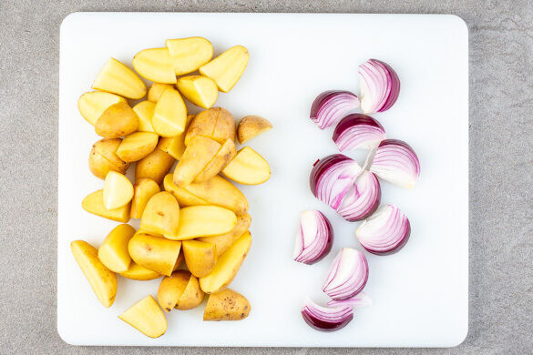 Den Backofen auf 240°C (220°C Umluft) vorheizen. Die Kartoffeln samt Schale je nach Größe halbieren oder vierteln. Die Zwiebel schälen und in ca. 1cm breite Spalten schneiden.