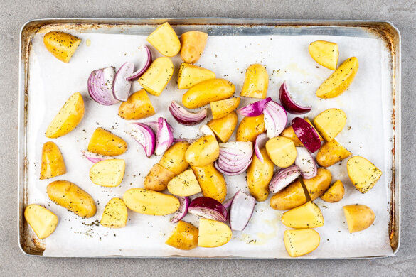 Die Kartoffeln und die Zwiebeln auf einem mit Backpapier ausgelegten Backblech mit 1EL Olivenöl, 1TL Oregano, ½TL Salz und 1 Prise Pfeffer vermengen und im Ofen 5–10Min. rösten.