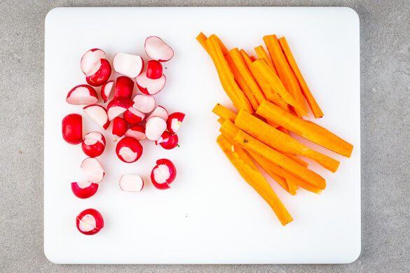 Die Radieschen halbieren. Die Karotte ggf. schälen und in dünne, pommesartige Stifte schneiden.