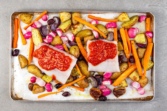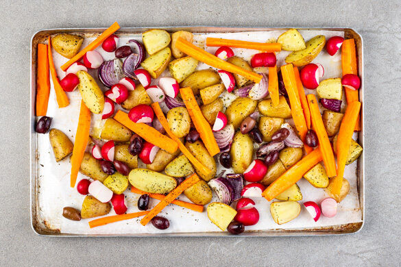 Die Radieschen, die Karotten und die Oliven zu den Kartoffeln und den Zwiebeln aufs Blech geben und leicht untermengen. 1EL Butter in kleinen Flöckchen über dem Gemüse verteilen, nach Belieben mit mehr Oregano würzen und alles weitere 8–10Min. rösten. Nach der Hälfte der Zeit einmal wenden.