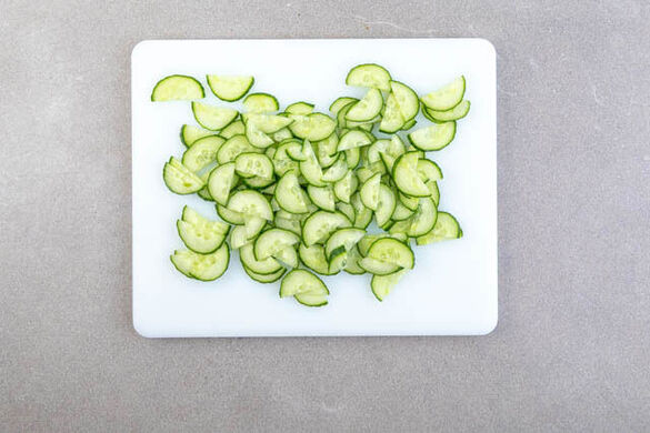 3EL Pflanzenöl, 2EL Essig und je 1 kräftige Prise Salz, Pfeffer und Zucker zu einem Dressing verrühren. Die Gurke und das Dressing ebenfalls abgedeckt kalt stellen.