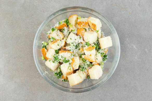 Die Brötchen in ca. 2cm große Würfel schneiden. Den Käse fein reiben. Den Schnittlauch in kleine Ringe schneiden und mit den Brotwürfeln und der ½ des Käses vermengen.