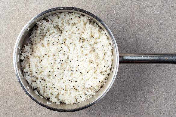 Den Reis in das kochende Wasser geben und abgedeckt bei niedrigster Hitze 8–10Min. kochen, bis das Wasser aufgesogen und der Reis gar ist. Noch ca. 5Min. ohne Hitzezufuhr ziehen lassen.