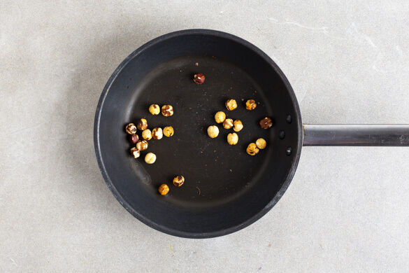 Die Haselnüsse in einer kleinen Pfanne ohne Zugabe von Fett bei mittlerer Hitze 1–2Min. goldbraun anrösten. Vorsicht, sie können schnell zu dunkel werden. Aus der Pfanne nehmen, etwas abkühlen lassen und anschließend grob hacken.