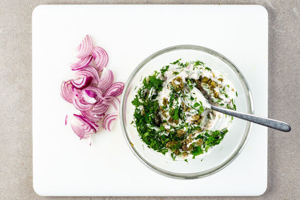 Die Zwiebel schälen und halbieren, eine Hälfte fein würfeln. Die andere Hälfte in Streifen schneiden und ggf. in etwas Wasser einweichen. Die Kapern und die Kräuter samt Stängeln fein schneiden. ¾ der Kräuter mit den Zwiebelwürfeln, den Kapern, 4EL veganer Mayonnaise, je 1EL Pflanzenöl und Essig sowie 3–4EL Wasser verrühren. Mit Salz und Pfeffer abschmecken.
