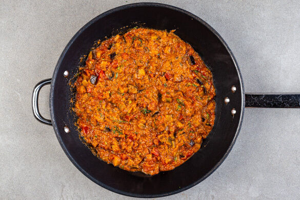 Den Speck in einer mittelgroßen Pfanne bei mittlerer Hitze 3–5Min. rundum anbraten, dann beiseitestellen. Die Auberginen und die Tomaten in die Pfanne geben und mit 1EL Olivenöl bei mittlerer Hitze in ca. 8Min. weich braten. Den Knoblauch hinzufügen und ca. 1Min. mitbraten, dann das Gemüse mit 200ml Wasser ablöschen und ca. 5Min. köcheln lassen.