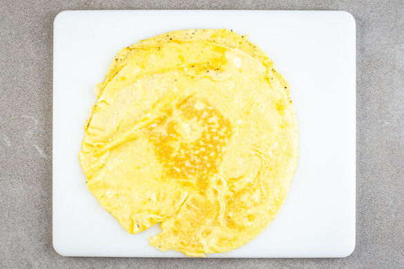Die Eier aufbrechen und mit 1 kräftigen Prise Salz verquirlen. In derselben Pfanne 2TL Pflanzenöl bei mittlerer Hitze erwärmen. Die Eiermischung hineingießen, dabei die Pfanne leicht schwenken, um ein gleichmäßiges Omelett zu erhalten. Das Omelett ohne Rühren 2–3Min. anbraten, dann wenden und in ca. 1Min. goldbraun und gar braten. Das Omelett aus der Pfanne nehmen.