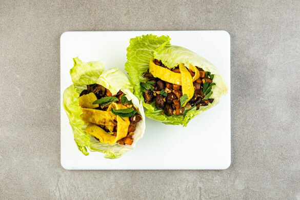Salatschiffchen sind eine tolle Sache: Sie bieten Platz für reichlich leckere Dinge und gleichen warme, herzhafte Zutaten durch ihre knackige Frische perfekt aus. Wir füllen unsere Salatblätter heute mit einem würzigen Süßkartoffel-Pilz-Gemüse, das zunächst im Ofen geröstet und anschließend mit einem Soja-Zitronengras-Dressing verfeinert wird. Außerdem mit dabei: feine Omelettstreifen, knackige Erdnüsse und frische Minze.